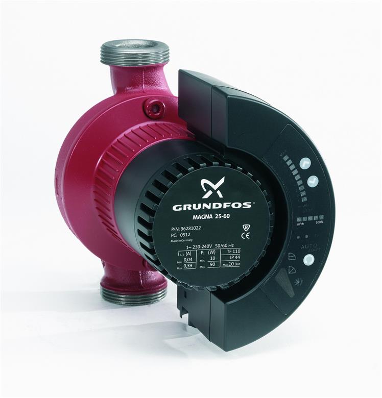 Obehové čerpadlo Grundfos Magna 25-60 s obtekaným rotorom, tj. čerpadlo a motor tvoria integrálnú jednotku bez upchávky hriadeľa, len s dvoma plochými tesneniami pre utesnenie. Čerpaná kvapalina maže ložiska. Obehové čerpadlo bez nutnosti údržby a s mimoriadne nízkymi náklady na dobu životnosti.